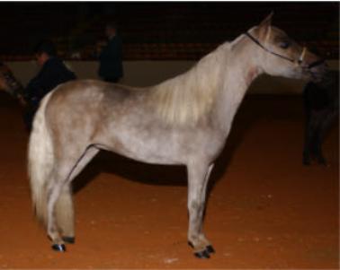 "Fawn", when clipped, is a fawn dapple color. She has won many awards including AMHA National Honor Roll Amateur Junior Mare, Level 2, AMHA National Top 5 Special Needs, and GNMHC RESERVE CHAMPION Solid color Mare. Her Grandsire, Wind Songs Royal Flush, won the title of National Grand Champion. Fawn's 2009 foal was a very nice, small smoky gray colored 19 1/4 in colt weighing in at only 23 lbs. on 11/09/09. She has a very sweet disposition to pass along to her foals. SOLD! |